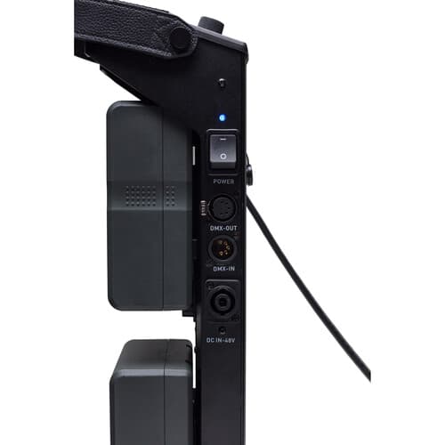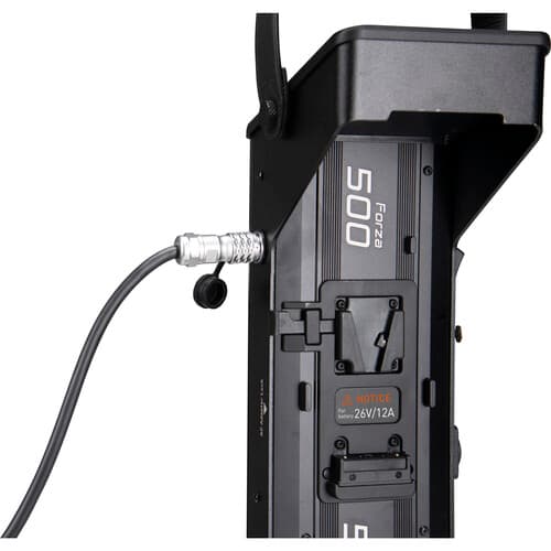 The Forza 500 is cooled by a quiet fan and is dimmable from 0 to 100%. One of the lights benefits is its AC/DC power options. The light is ready for worldwide use thanks to its 110 to 240 VAC power supply, but it can also run on optional V-mount batteries when mains current is unavailable. Run time is approximately one hour at full power. The Forza 500 ships with a yoke and 5/8 receiver that accepts industry-standard light stands.